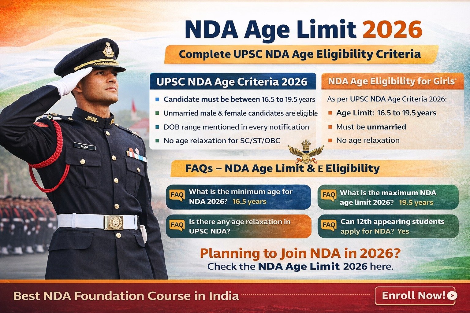 Since NDA is conducted twice a year (NDA I & NDA II), the age eligibility slightly varies as per the course commencing date.